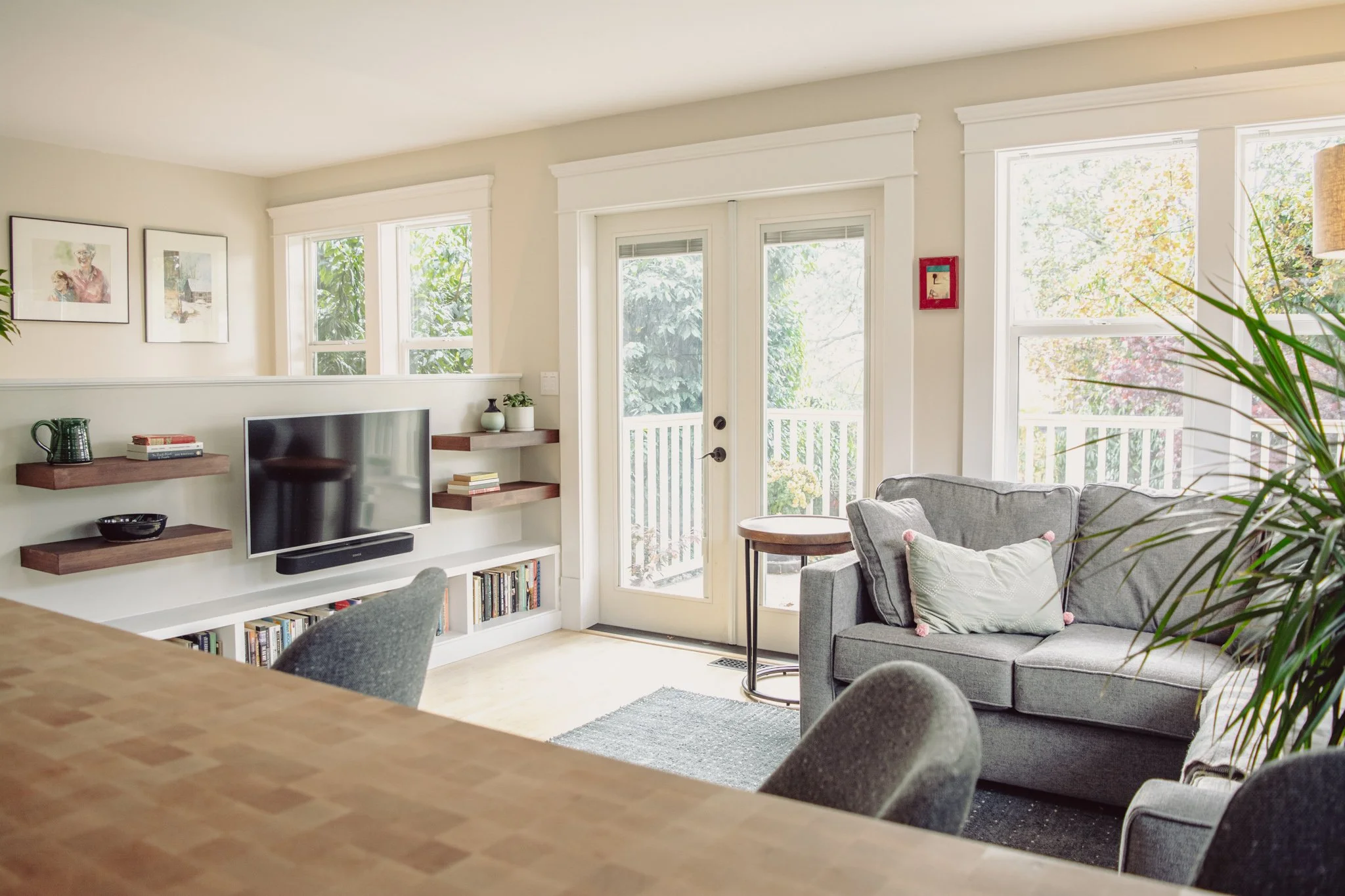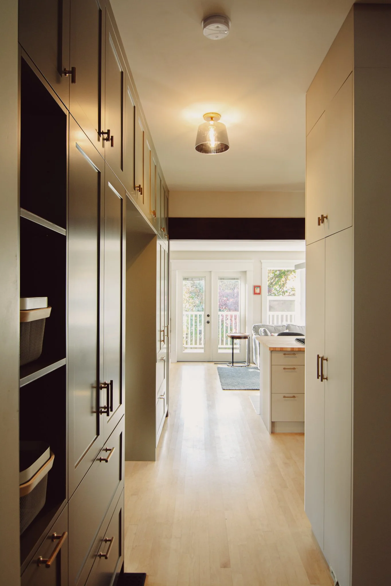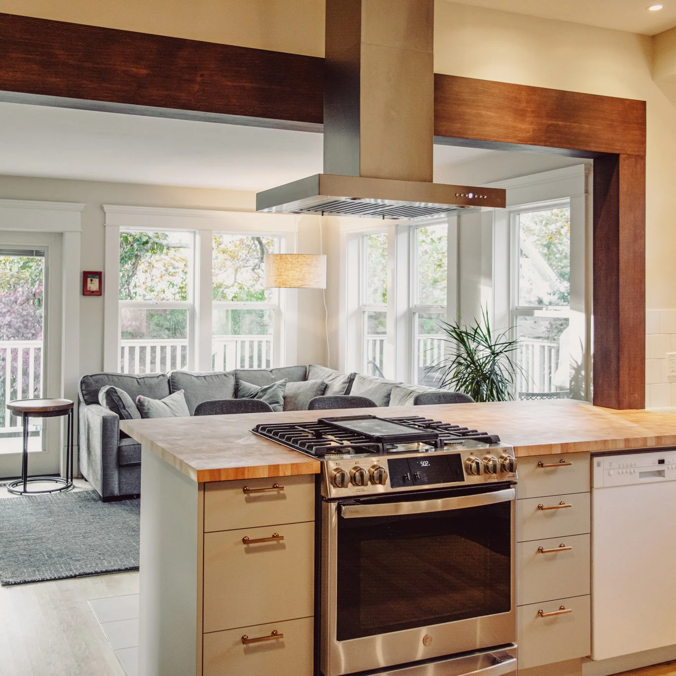 Working within existing conditions can provide constraints that enrich the design process, as was the case with this character renovation. The structural wall between the kitchen and living room was replaced with a fir-wrapped beam to open up the floor plan while maintaining a natural separation between the two spaces. The existing kitchen was updated with new cabinet faces, open corner shelving, and custom butcher-block countertop. New full-height cabinets created a threshold to the dining room and a place to hide away toaster crumbs. Updated lighting, hardware, tile, appliances, and furniture brought both elegance and durability. Simple changes added up to equal a whole greater than the sum of its parts - a mix of modern and classic detailing that perfectly fits the needs of this active family.