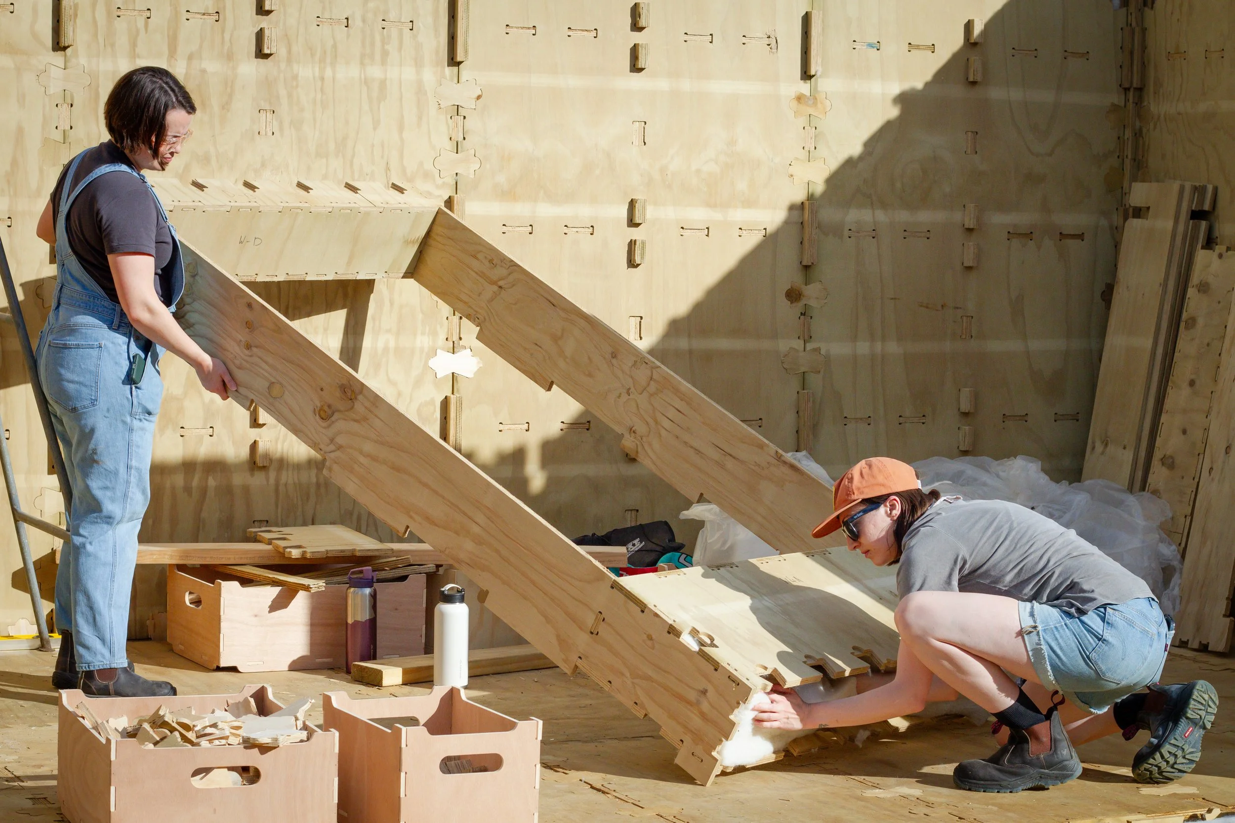 Our work focused on translating design concepts into buildable solutions using the Wikihouse system - an open-source platform of plywood building blocks that assemble without nails. We supported the team from early prototyping to building permit drawings, while balancing structural requirements, material properties, and user experience. Through iterative testing, we refined proportions, detailing, and construction techniques, ensuring each element could be assembled efficiently while maintaining design quality.
